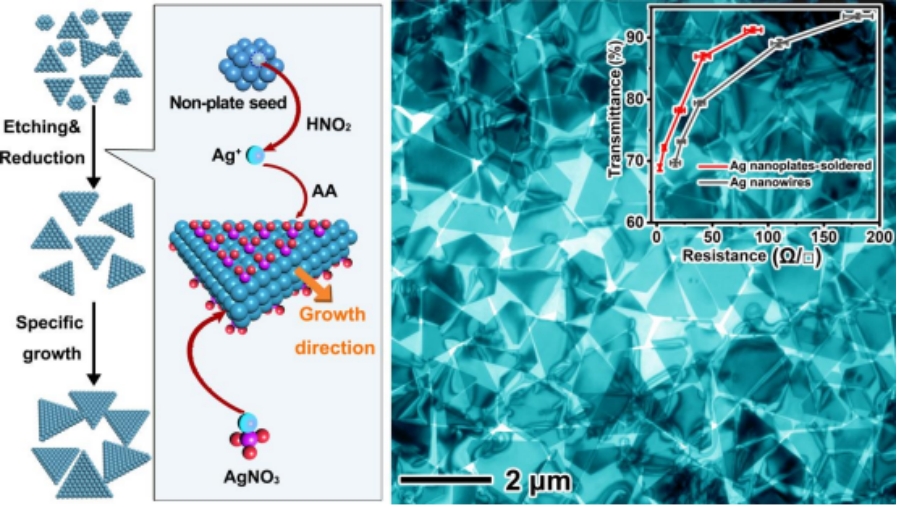 为破解这一难题,研究团队创新性地提出了亚硝酸盐辅助的种子生长策略。该策略通过亚硝酸盐的双重调控作用,一方面有效抑制银的自成核过程,避免多晶核无序生长;另一方面可高度选择性吸附于银的{111}晶面,精准限制晶体沿厚度方向的生长,最终成功制备出厚度约2纳米的超薄银纳米片。该产物不仅具备高纯度、尺寸可调的优势,其超薄结构还能促进银纳米线的低温焊接,显著降低导电网络的接触电阻,大幅提升柔性电极的导电性能与稳定性。