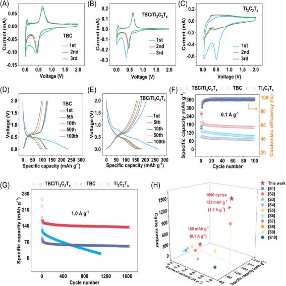 在0.1 A g⁻¹电流密度下(图4F),TBC/Ti₃C₂Tₓ的比容量(160 mAh g⁻¹)显著优于纯TBC(93 mAh g⁻¹)和Ti₃C₂Tₓ(70 mAh g⁻¹)。更令人瞩目的是,在1.0 A g⁻¹高倍率下循环1600次后(图4G),仍保持133 mAh g⁻¹的可逆容量,这一性能在已报道材料中处于领先水平。倍率测试(附图S7)显示,在0.1-4.0 A g⁻¹电流范围内,TBC/Ti₃C₂Tₓ的容量保持率高达78.4%(120-153 mAh g⁻¹)。图4H的对比分析表明,该材料兼具超高循环稳定性(1600次)与高容量特性(0.1 A g⁻¹下100次循环后160 mAh g⁻¹)。