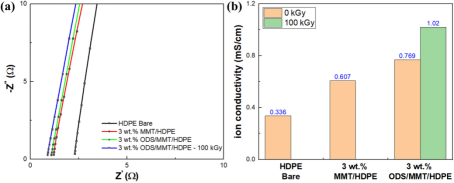 为探究不同隔膜对电池循环性能的影响机制,本研究系统测试了离子电导率、锂离子迁移数和交流阻抗等关键参数。选用隔膜类型与循环测试保持一致,包括纯HDPE、3wt.% MMT/HDPE、3wt.% ODS/MMT/HDPE及经辐照处理的3wt.% ODS/MMT/HDPE四种样品。