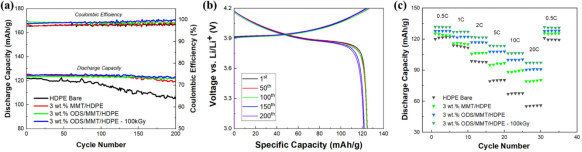 在0.5C充放电倍率下循环200次后(图9a),四组样品的放电容量保持率呈现梯度提升:纯HDPE隔膜为86%,MMT/HDPE提升至94.6%,ODS/MMT/HDPE达到97.2%,而经电子束辐照的ODS/MMT/HDPE隔膜表现出最优异的98.7%保持率。值得注意的是,纯HDPE样品在50次循环后出现显著衰减,而两种ODS/MMT/HDPE样品(无论是否辐照)在200次循环前后均保持95%以上的容量保持率。库伦效率测试结果同样呈现递进趋势:四组样品分别为97.7%、98.5%、99.1%和99.6%,虽然均高于锂离子电池95%的常规标准,但改性隔膜仍展现出明显的提升效果。