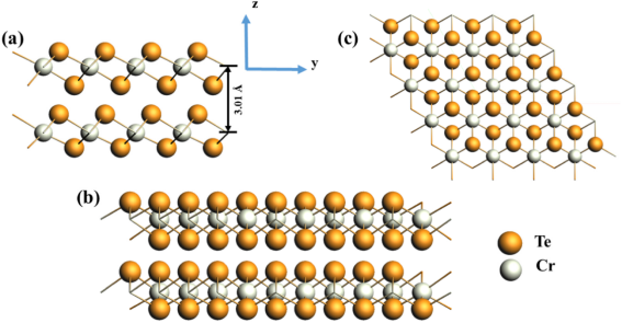 本研究通过构建4×4超胞CrTe2模型(含96个原子:32个Cr原子和64个Te原子)系统评估其电化学性能。该材料具有典型的A-B-A三明治结构,其中过渡金属Cr被两个碲(Te)原子层夹覆,形成共价键连接的X-M-X准二维六方晶格(空间群Pm1)。如图1所示,优化后的晶体结构显示:晶格参数a=b=3.86 Å,c=6.20 Å,α=β=90°,γ=120°;层间距为3.01 Å,Cr-Te键长2.74 Å(与文献报道值吻合)。侧视图(图2b)清晰显示由于化学计量比M:X=1:2,单层Cr被双层Te原子夹覆,形成高度为3.33 Å的三明治单元结构。