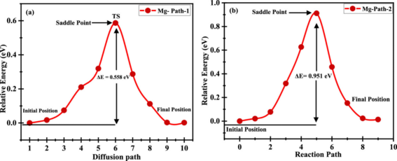 对于Mg离子的扩散研究(图11)显示:x轴向迁移势垒为0.55 eV,与MoS2(0.57 eV)相当;而垂直六元环方向的势垒升至0.95 eV,与B2C材料相近。Al离子的扩散表现出独特选择性(图12):x轴向势垒仅0.42 eV,但垂直方向势垒急剧增至1.33 eV。这些数据揭示: