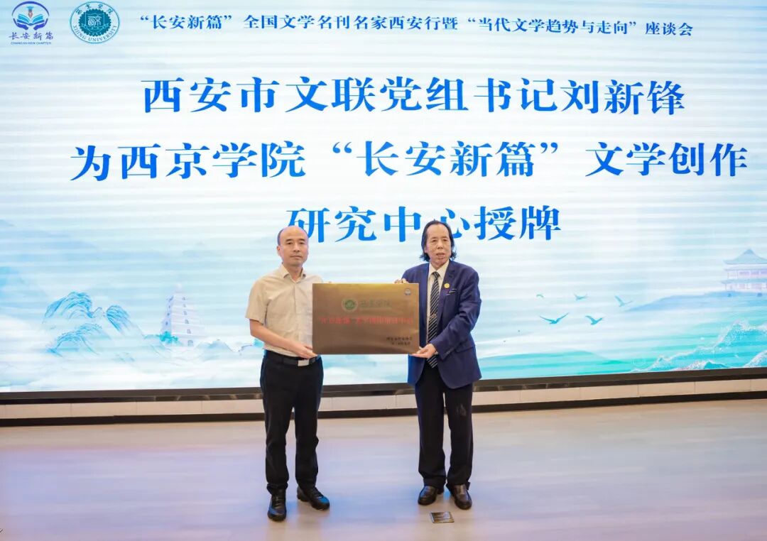 仪式现场环节丰富,西安市委宣传部副部长、市委文明办主任王辉为全国文学名刊名家李秀龙、林森、哲贵、李寂荡、弋舟颁发“长安新篇”文学创作特聘导师聘书;西安市文联党组成员、副主席蔡鑫向五位名家赠送“西安印象”文墨作品,传递古都文化温度;西安市文联党组书记刘新锋为西京学院“长安新篇”文学创作研究中心授牌,这一举措不仅是对西京学院在人文育人、文学传播领域实践的肯定,更标志着校地携手推动文学创作迈入新起点,对西安文学事业发展、高校人才培养及城市文化建设具有多重关键意义。