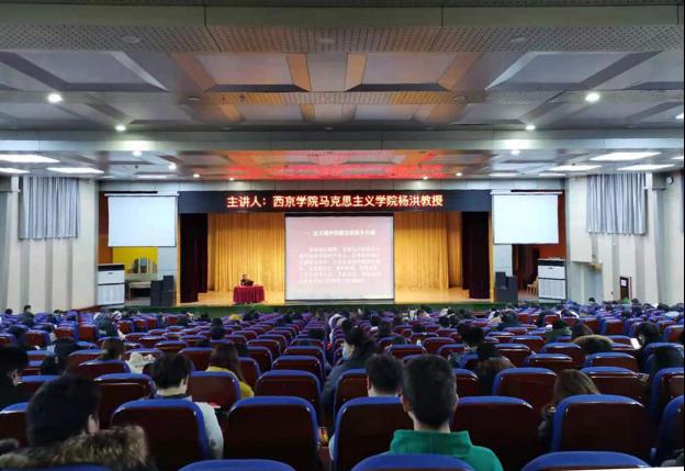 12月3日下午,西京思政讲坛第二十五期报告会在我校小礼堂举办,马克思主义学院院长杨洪教授作了题为《延安精神及其当代价值》的专题报告。报告会由马克思主义学院王俊副教授主持,马克思主义学院全体教师、学校辅导员代表、博雅书院全体学生参加了报告会。