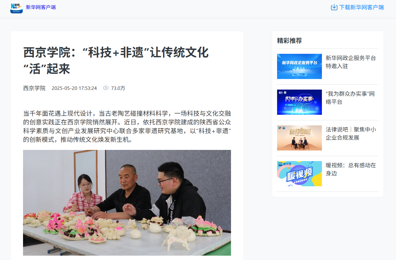 当千年面花遇上现代设计,当古老陶艺碰撞材料科学,一场科技与文化交融的创意实践正在西京学院悄然展开。近日,依托西京学院建成的陕西省公众科学素质与文创产业发展研究中心联合多家非遗研究基地,以“科技+非遗”的创新模式,推动传统文化焕发新生机。