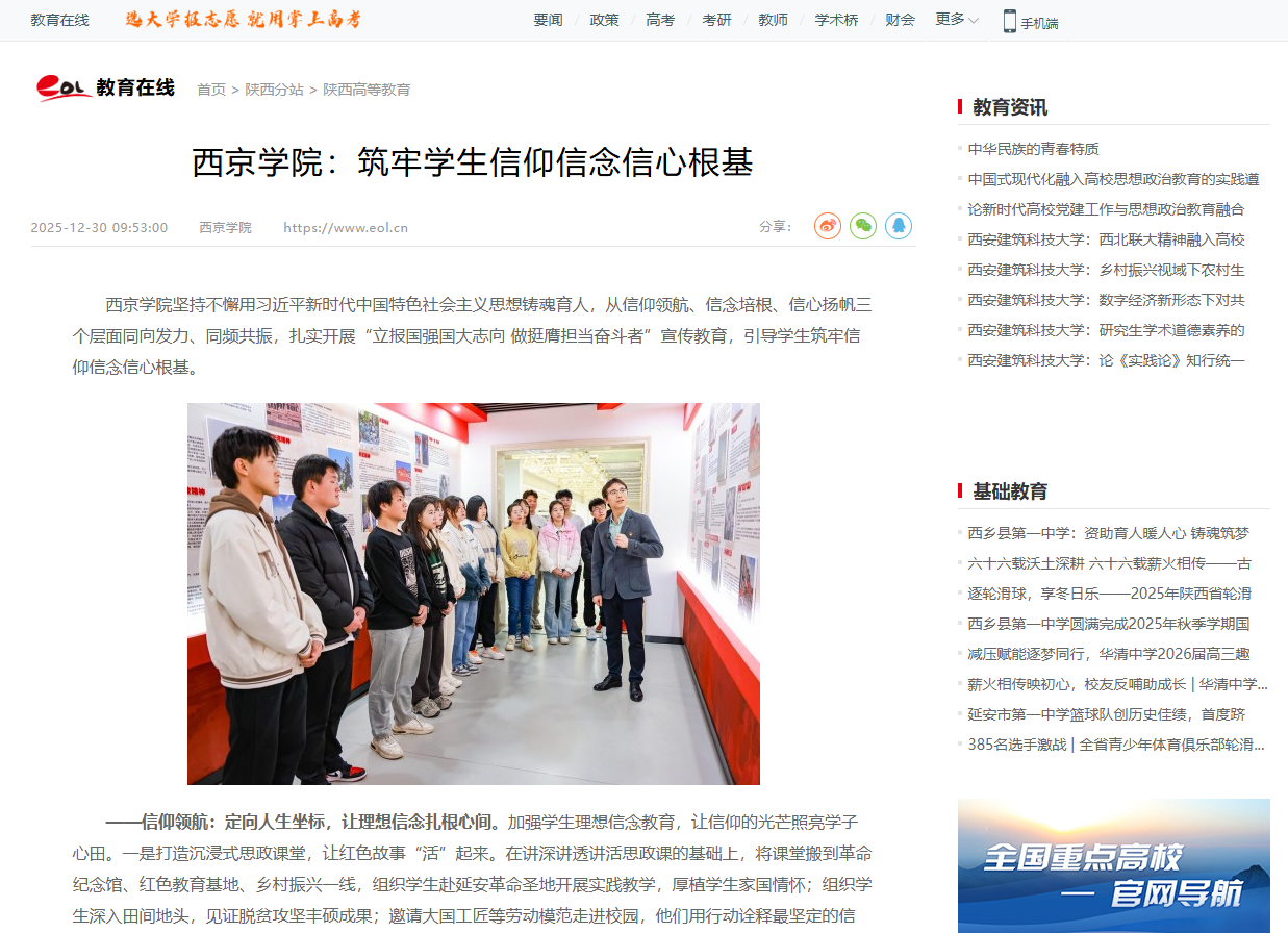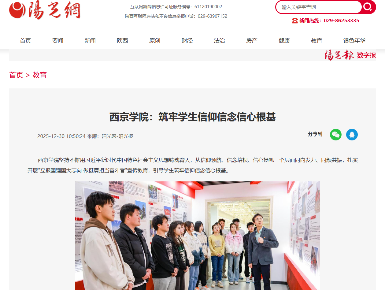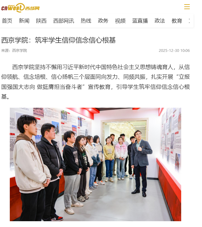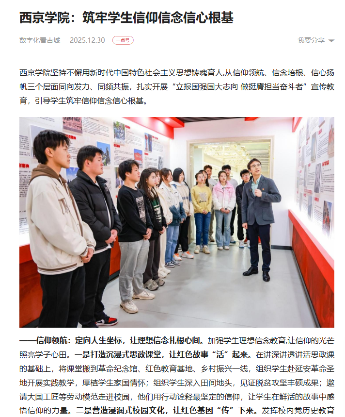 ——信仰领航:定向人生坐标,让理想信念扎根心间。加强学生理想信念教育,让信仰的光芒照亮学子心田。一是打造沉浸式思政课堂,让红色故事“活”起来。在讲深讲透讲活思政课的基础上,将课堂搬到革命纪念馆、红色教育基地、乡村振兴一线,组织学生赴延安革命圣地开展实践教学,厚植学生家国情怀;组织学生深入田间地头,见证脱贫攻坚丰硕成果;邀请大国工匠等劳动模范走进校园,他们用行动诠释最坚定的信仰,让学生在鲜活的故事中感悟信仰的力量。二是营造浸润式校园文化,让红色基因“传”下来。发挥校内中国共产党历史教育馆、史沫特莱展等“六馆一中心”育人功能,让红色文化春风化雨般浸润学生的日常生活。举办“烽火回声·青春誓言”抗战主题红歌合唱比赛,师生用嘹亮的歌声唱响爱党爱国主旋律,抒发对党和国家的无限忠诚与热爱。推出“红旗下的国际友人系列讲座”短视频,用学生喜欢的方式传播信仰的力量,让红色基因在潜移默化中浸润学生心灵。三是搭建多元化实践平台,让信仰力量“实”起来。持续开展学雷锋志愿服务系列活动等,引导西京学子参与敬老助残、环境保护、应急救援等志愿活动,他们在实践中经受了锻炼、增长了才干、坚定了信念,也深刻理解“为人民服务”的深刻内涵,将个人理想融入国家发展大局,让信仰从思想认同转化为行动自觉。