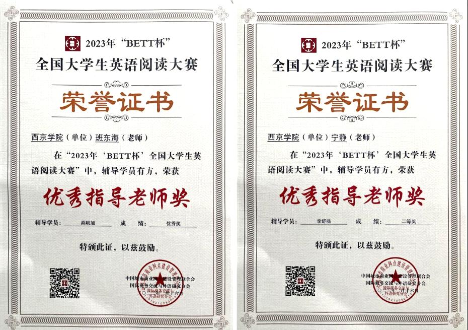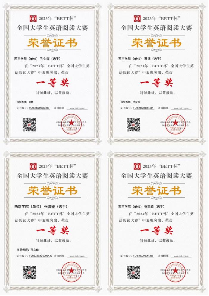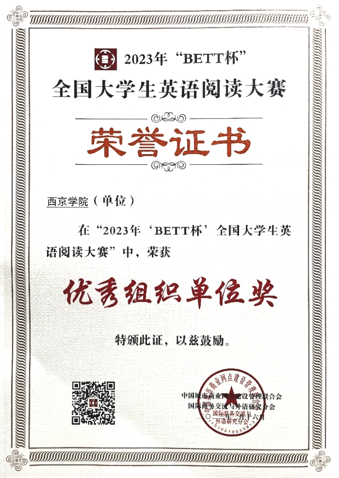 西京网讯:日前,由中国城市商业网点建设管理联合会国际商务交流与外语研究分会主办的2023年全国大学生英语阅读大赛成绩公布,我校14名同学喜获佳绩,其中一等奖5名,二等奖3名,三等奖5名,优秀奖1名。我校被组委会评委“优秀组织单位奖”。