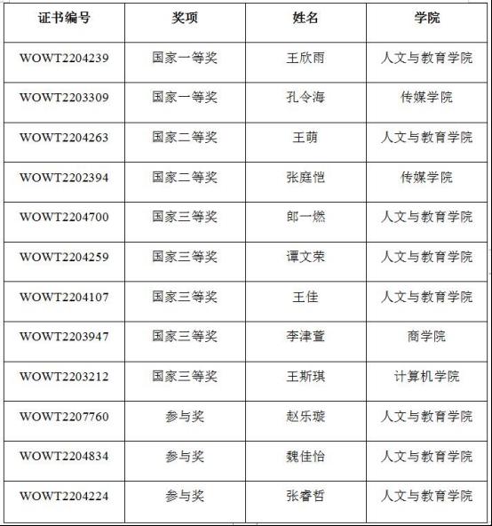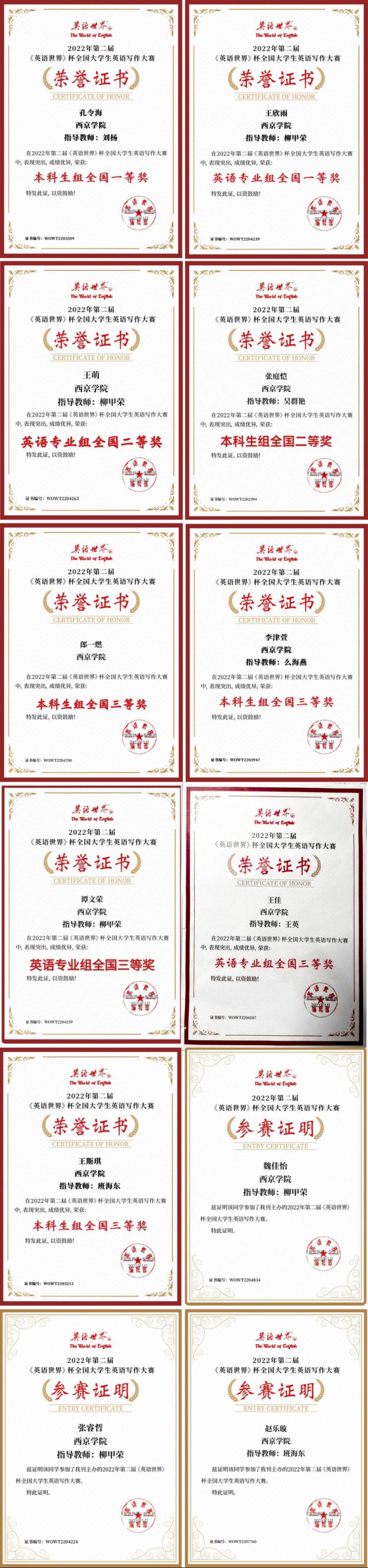 由商务印书馆《英语世界》杂志社举办的第二届《英语世界》杯全国大学生英语写作大赛成绩揭晓,我校12名同学获得国家级奖项,其中,一等奖2人、二等奖2人、三等奖5人、参与奖3人,并于近日收到组委会颁发的获奖证书。