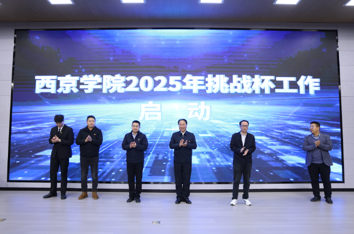 在2025年“挑战杯”启动仪式环节,与会领导与学生代表在大屏幕前共同启动西京学院2025年“挑战杯”工作,开启2025年“挑战杯”新征程。