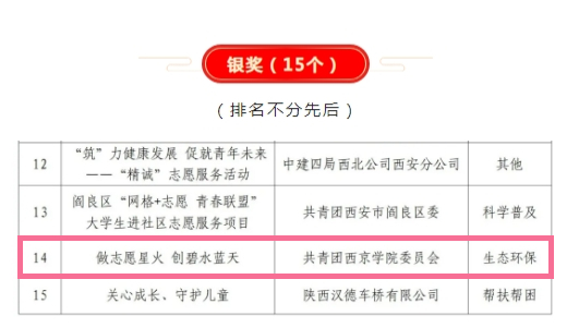 11月25日,西安市第二届青年志愿服务项目大赛获奖项目名单公示,经项目征集、项目初评、路演展示、专家终评、组委会审定,我校《做志愿星火,创碧水蓝天》《环保在行动 绿色满人间》《拾忆童趣,童梦时光》分别斩获银奖、铜奖、优秀奖。