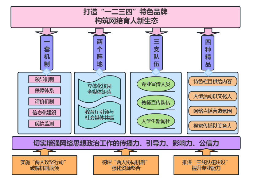 这一系统性工程不仅提升了网络思想政治工作的质量和实效,实现了网络育人从“单点突破”到“系统推进”、从“分散运营”到“矩阵协同”、从“数量增长”到“质量提升”的转变,最终形成网上网下融合、课内课外贯通、校内校外联动的“大思政”格局,切实增强网络思想政治工作的传播力、引导力、影响力、公信力。