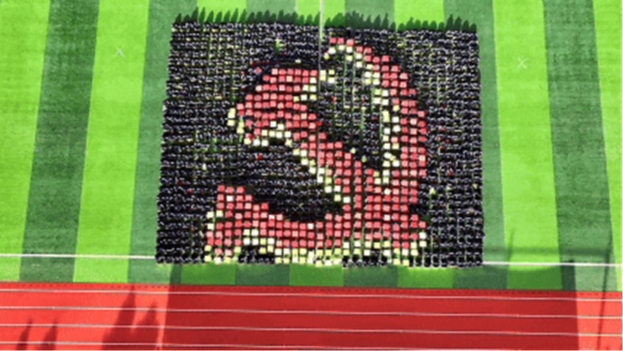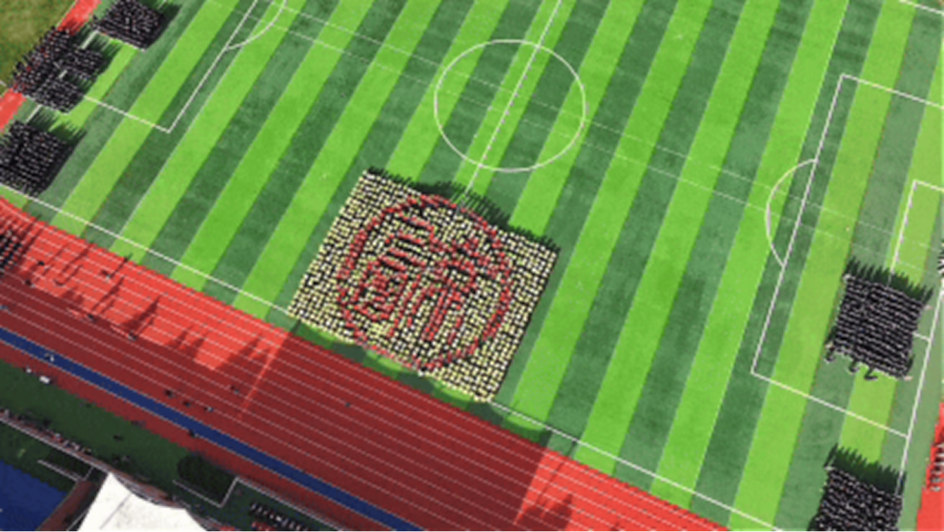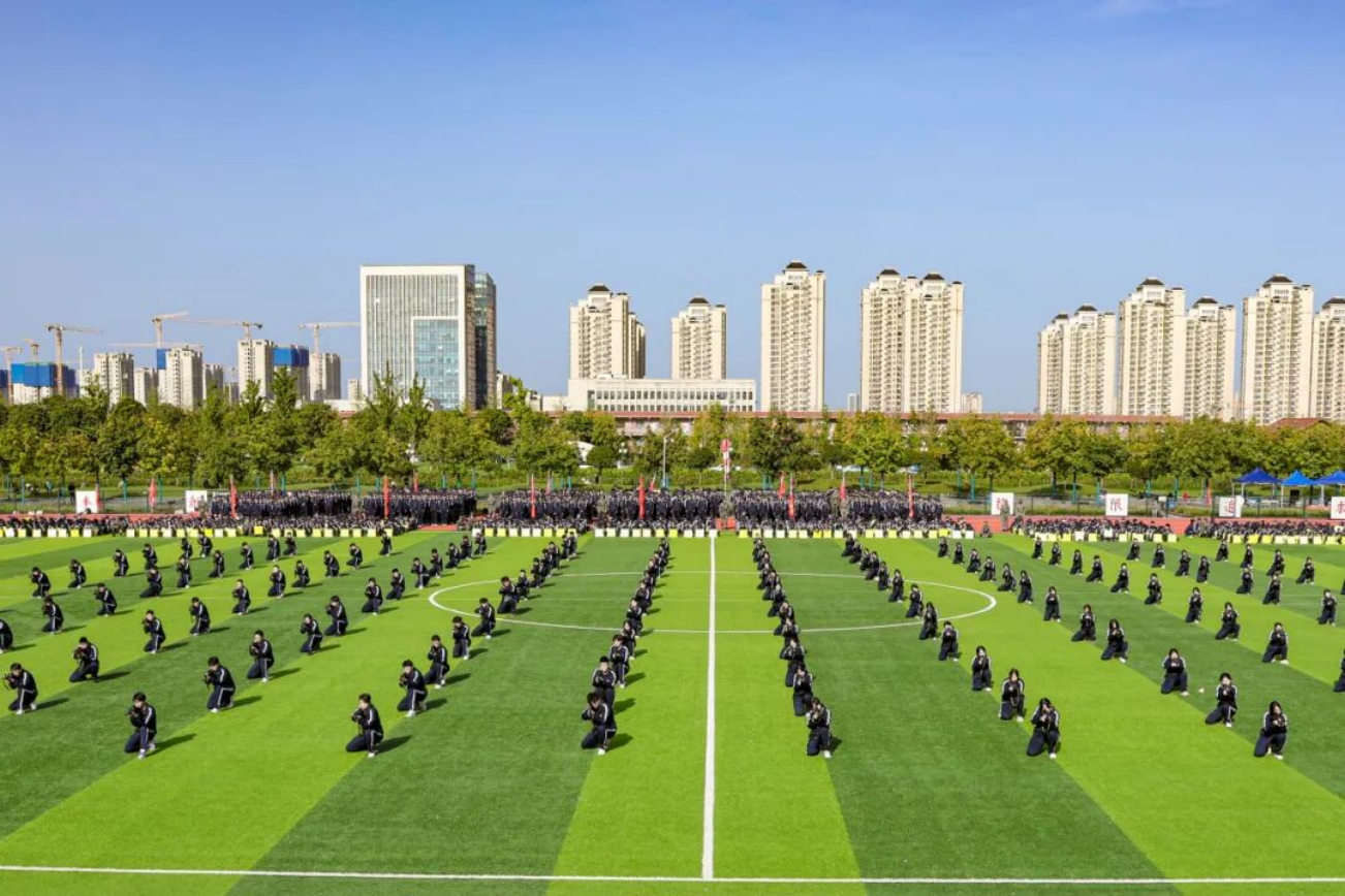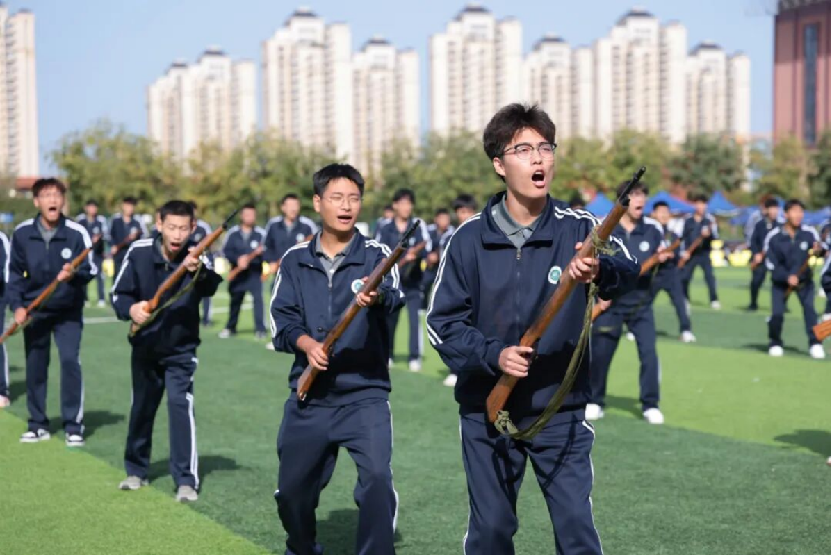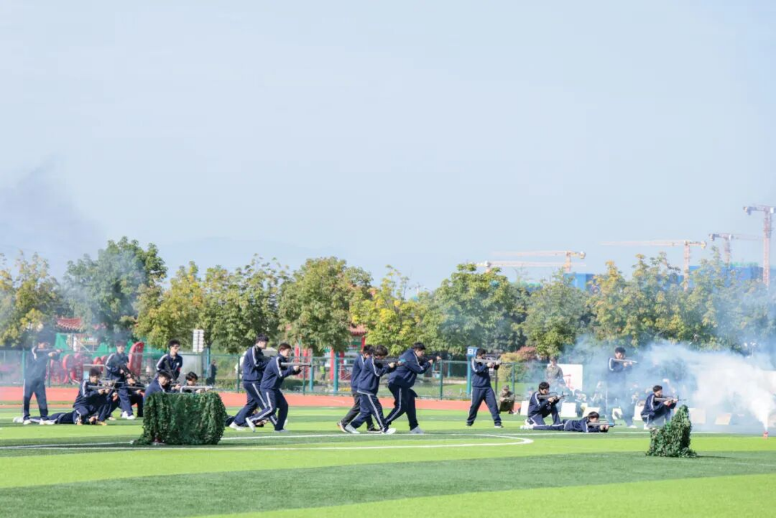 百年征程波澜壮阔。花样列队方阵汇报中,新生们以精准的步伐变换队形呈现出红船、党徽、“九一八”“1945-2025”“80”等图案。从战火纷飞到书声琅琅,历史的接力棒已传到新时代青年手中,随后又组成“西京”“诚健博能”“请党放心、强国有我”“爱我中华”“爱我西京”等醒目文字,一幅幅波澜壮阔的历史画卷,在绿茵场上徐徐展开,将红色基因与青春力量完美融合,让人热血沸腾。