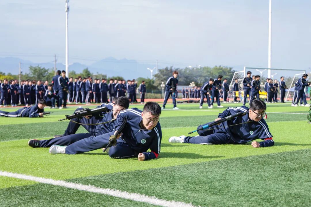 军训场上,各方队尽显硬核实力。战术方队成员在模拟战场中灵活穿梭,匍匐前进、交替掩护,每一个动作都精准利落,尽显实战风范;橡胶警棍术方队手持警棍,劈、戳、挡、架间气势如虹,招式连贯有力,展现出十足的纪律性与威慑力;刺杀方队队员眼神坚毅,刺、劈、挑、拨等动作整齐划一,仿佛重现了战场上的热血冲锋场景;匕首操方队则以敏捷身姿演绎招式,出刀迅猛、收刀利落,将力量与技巧完美融合;擒敌拳方队更是刚劲十足,直拳、勾拳、摆拳连贯出击,踢腿、格挡干脆有力,一招一式都透着坚毅与果敢。战术综合演练中,各方队还联合开展战术综合演练,模拟实战场景协同作战,充分展现了新生们在军训中的蜕变与成长,用铁血风采书写青春担当。