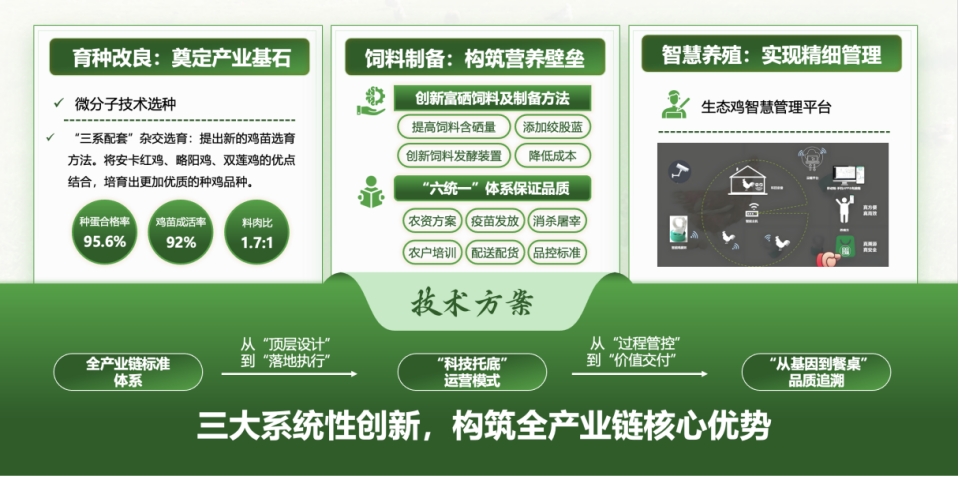 “润硒良禽”项目利用秦巴山区的富硒资源,推动农业资源转化与乡村产业振兴。项目团队开展调研57次,成立平利县茶粞缘禽业有限公司,以“富硒鸡”为核心产品,在梁林蒙副教授指导下,构建了从基因选育到产品上桌的全产业链解决方案。项目团队覆盖农业技术、大数据管理与应用及电子商务领域,并通过技术创新获得6项授权专利,建立了知识产权壁垒。