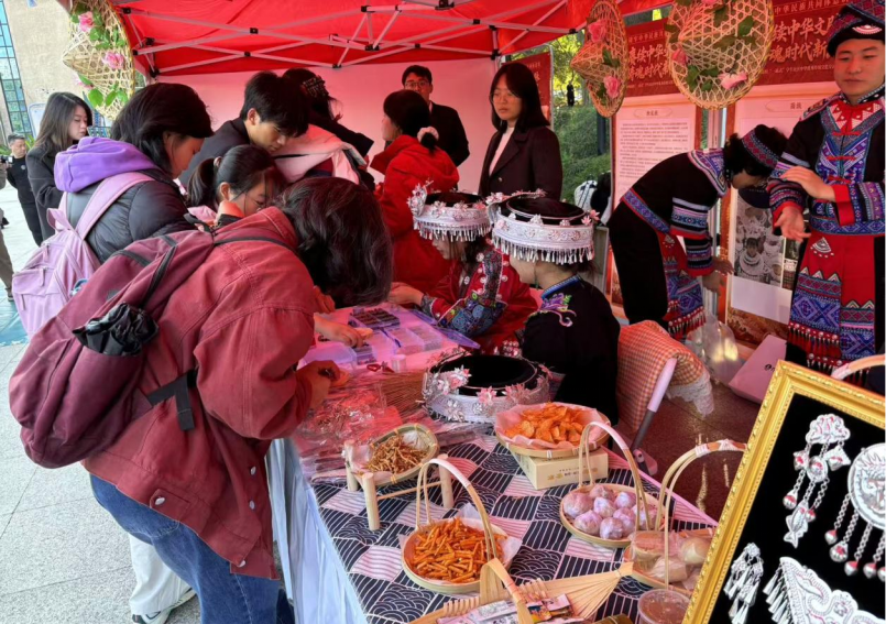 实物展单元由允能书院负责布置,展出包括中药手串、泥哨等物品,现场提供特色食品,并有苗族学生进行讲解。