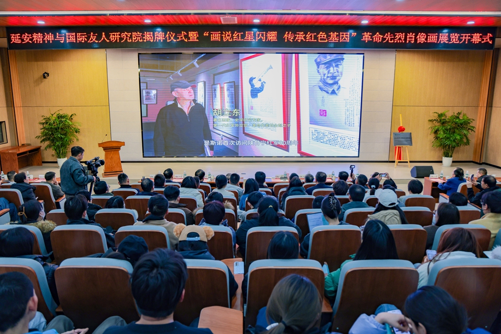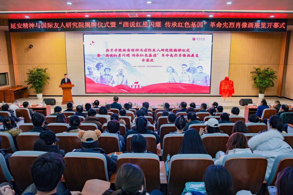 12月16日下午,西京学院延安精神与国际友人研究院揭牌仪式暨“画说红星闪耀 传承红色基因”革命先烈肖像画展览开幕在西京学院工程舫学术报告厅举行。陕西省第十四届人大常委会委员、教科文卫委员会副主任委员任宗哲,陕西省委宣传部宣传教育处副处长王志伟,延安红星园国际文化交流园区董事长马逸飞,西京学院校长任芳,西京学院党委书记、督导专员李邦邦等领导出席活动,陕西省翻译协会、陕西省斯诺研究中心、各基层党委、直属党支部书记及200余名师生代表齐聚一堂,以红色为媒、以精神为魂,共同见证融合红色基因传承与国际文化交流的重要时刻。