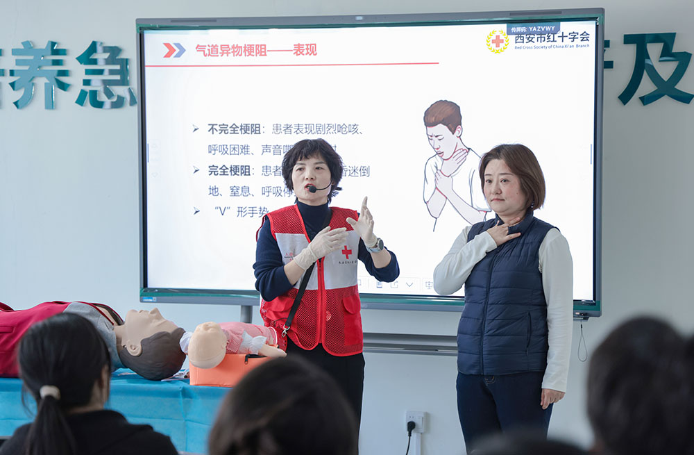 本次培训分为理论讲授、实操演练与考核认证三个阶段。长安区红十字会急救培训师、中国红十字应急救护认证培训师陈莉担任主讲。她结合一线救援与教学经验,系统讲解了心肺复苏、AED使用及海姆立克急救法等急救理论知识,重点说明了操作流程、技术要点与常见误区。