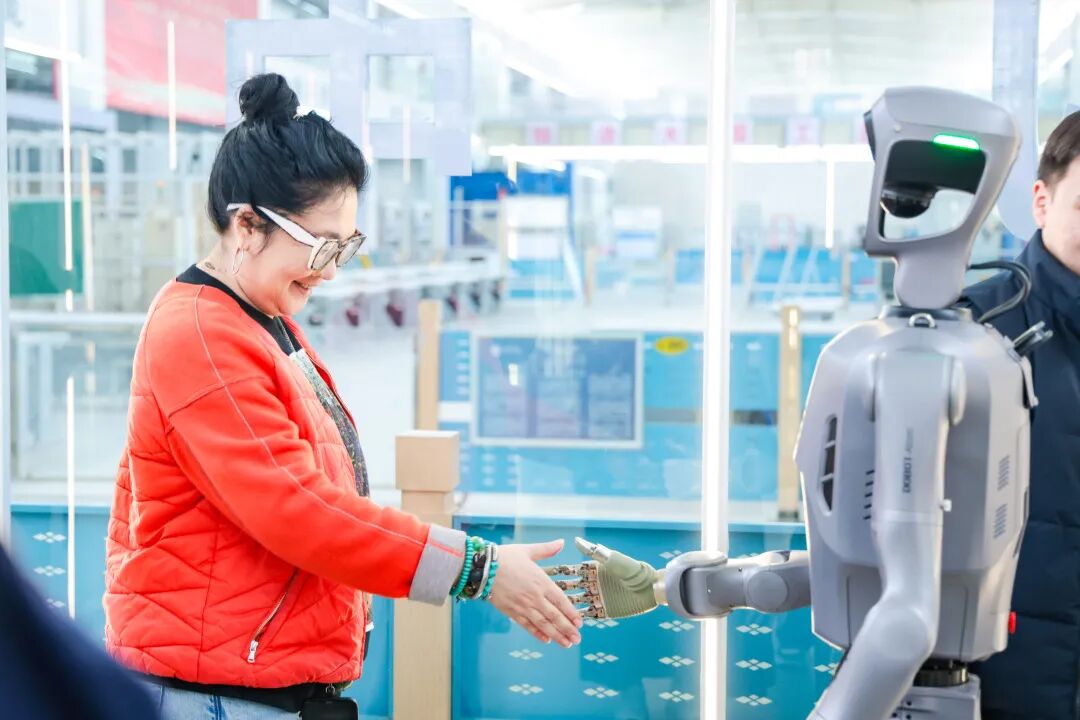 此外,机器狗与人形机器人的展示区同样人气爆棚。呆萌的机器狗在指令下灵活穿梭,熟练完成蹲起、爬坡、打拳等动作,引得研学团成员纷纷上手操作;人形机器人则凭借流畅的动作,灵活模仿人类行走、握手等姿态,逼真的表现让大家连连驻足拍照、啧啧称赞。