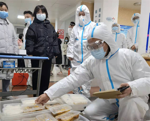 行政干部、辅导员身着防护服深入学生宿舍,为同学们选餐,了解学生生活学习情况,提醒大家按时做核酸、做好疫情防控解释工作。