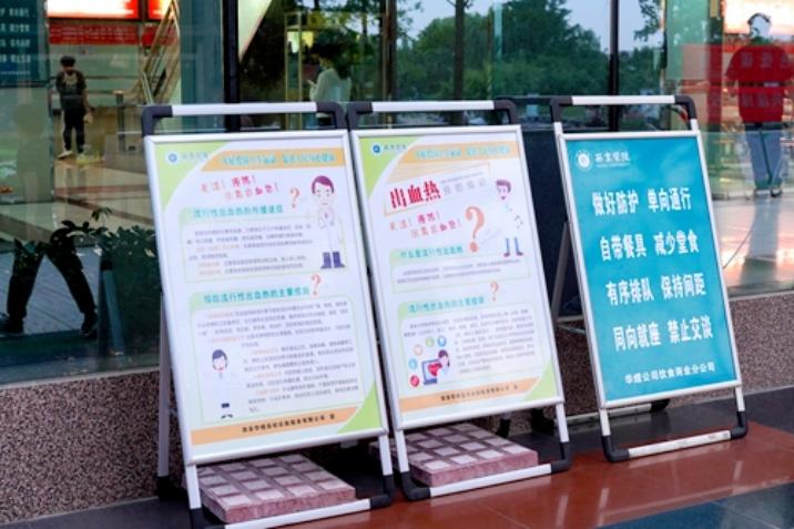 线下宣传活动同样通过三种方式进行:一是联合西京学院青年志愿者协会允能分会在璞玉楼餐饮中心门口发放出血热宣传彩页;二是在璞玉楼餐饮中心门口摆放出血热宣传展板;三是联合公寓管理分公司,在每栋学生公寓楼张贴出血热宣传海报,引导学生学习和了解出血热相关知识。