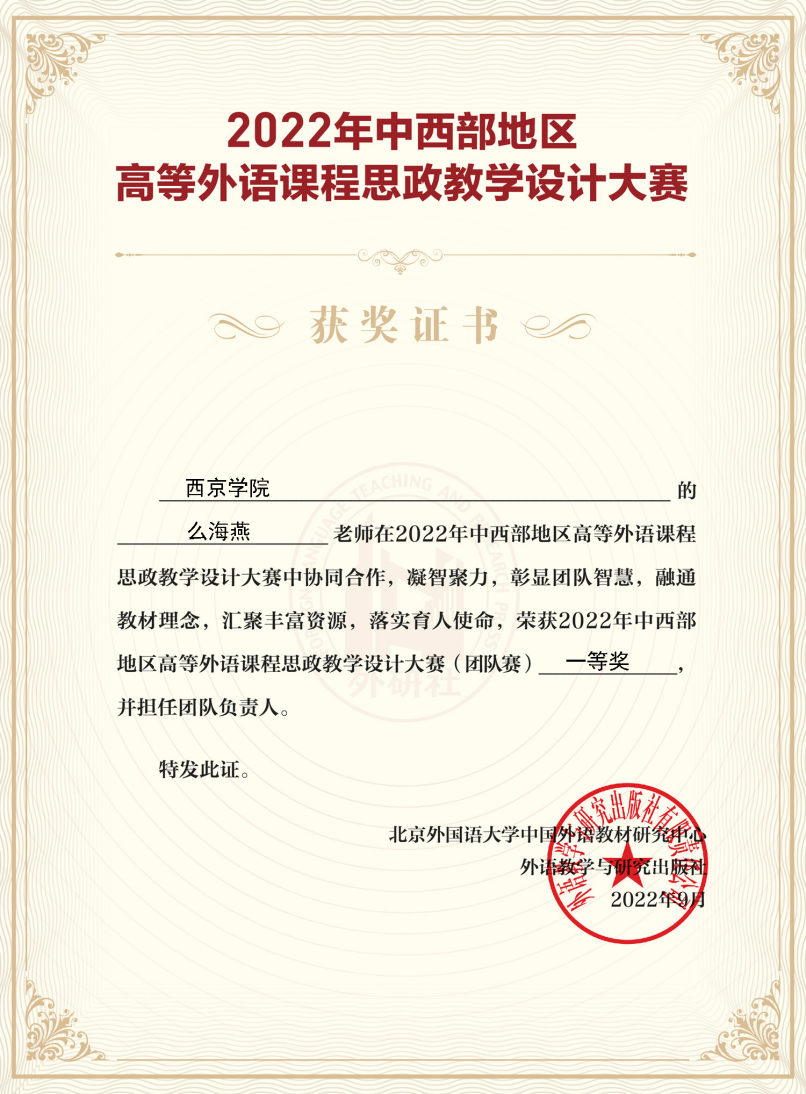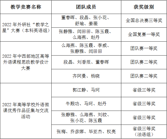 近日,人文与教育学院教师在多项教师教学技能竞赛中再创佳绩,在2022年外研社“教学之星”大赛(本科英语组)中获全国总决赛三等奖1项、全国复赛一等奖1项,在2022年高等学校外语微课优秀作品征集与交流活动中获省级三等奖4项,在2022年中西部地区高等外语课程思政教学设计大赛中获团队赛一等奖1项、二等奖2项。
