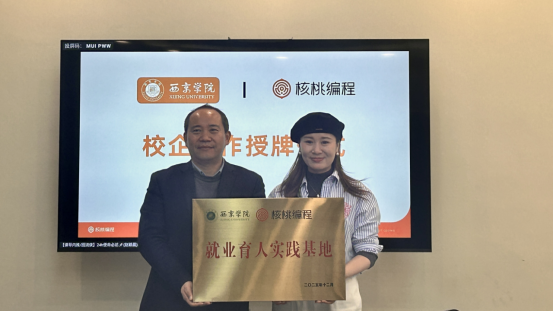 核桃编程全国课导招聘负责人苗洁对学院一行表示热烈欢迎,双方就选派企业导师入校授课、推动校内实训项目等达成共识。座谈结束后,郭建新副校长与苗洁共同为“就业育人实践基地”揭牌。