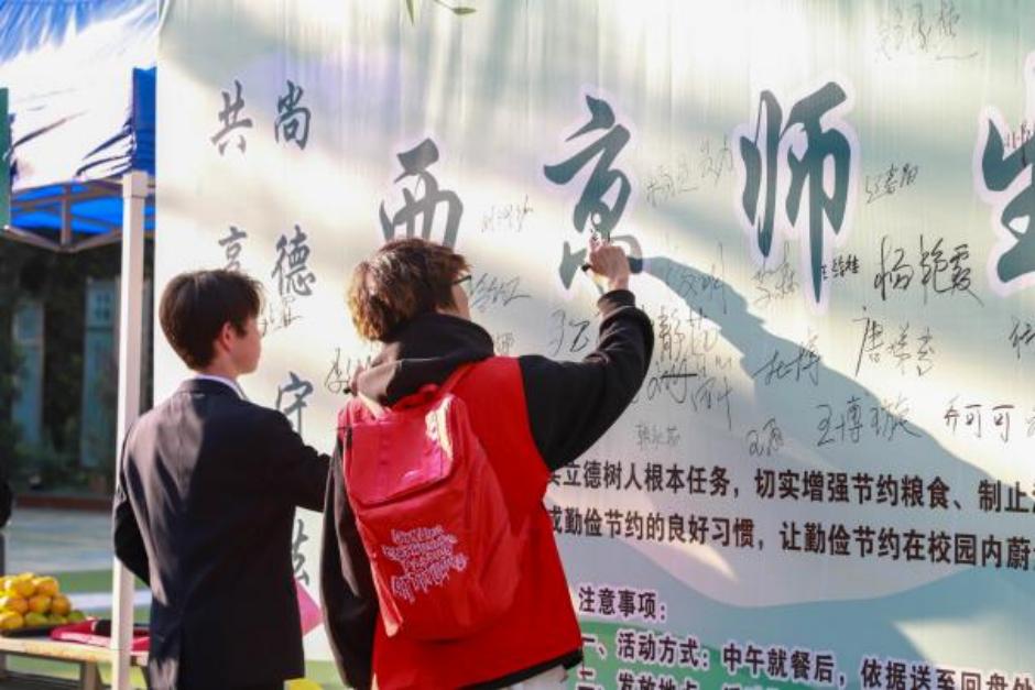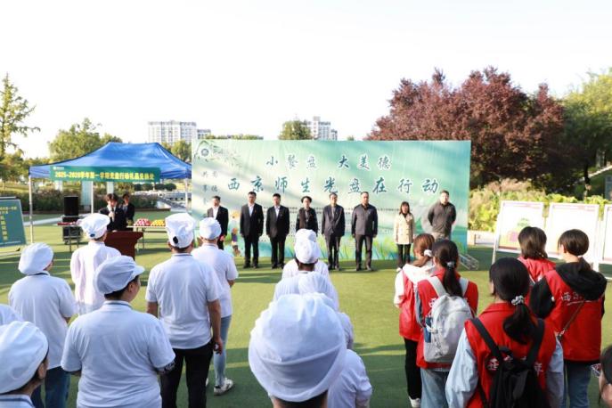 唐娣芬宣布“2025-2026学年第一学期光盘行动”正式启动。现场师生代表有序在“小餐盘,大美德——西京师生光盘在行动”桁架上签名,传递积极参与爱粮节俭的决心。