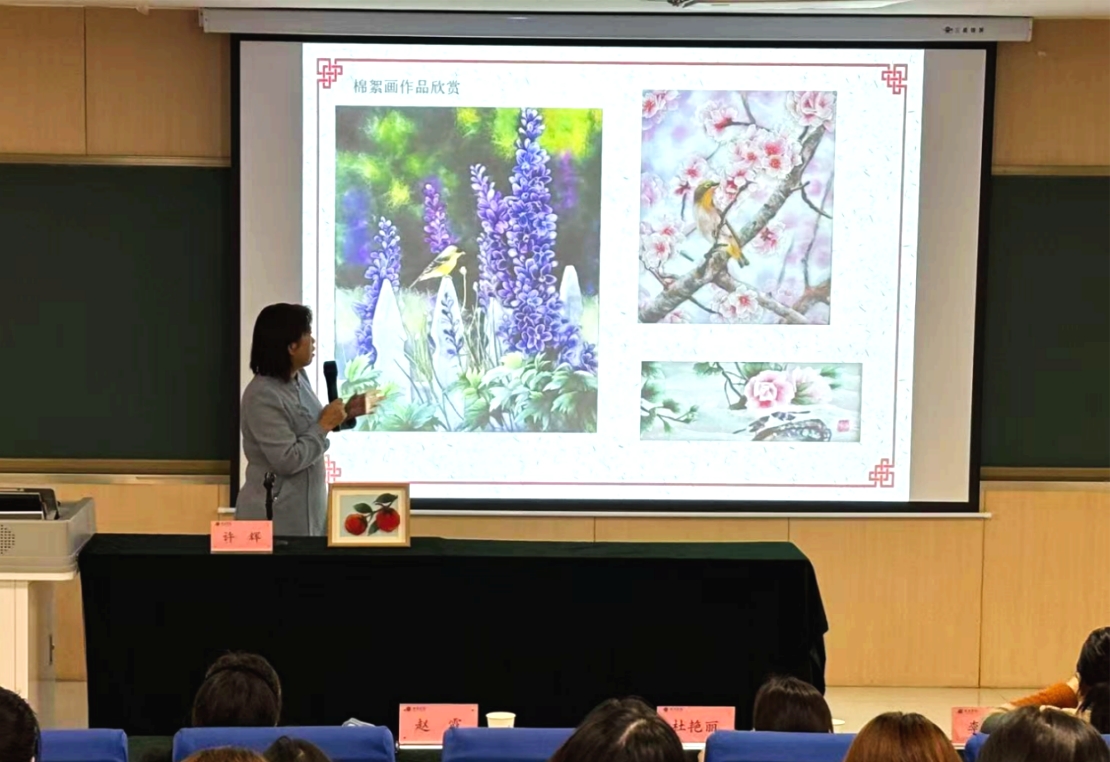 许辉首先介绍了棉絮画的历史渊源与艺术特点。随后进行现场制作示范,展示棉絮通过揉捏、分层、粘贴等步骤形成画作的过程。她对参与者提出的问题进行了答疑。